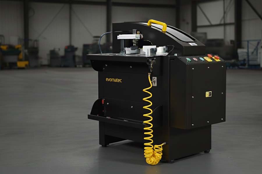 Mouvement hydropneumatique. Système d'étau pneumatique vertical et horizontal. Travail sécurisé grâce à la protection apportée par le détecteur de sécurité. Retour automatique à la position initiale. Fraisage à angles divers grâce à une équerre graduée. Changement de lame facile Convoyeur de Support pour profilé. Station d'attente pour lame. Adaptateur de lame